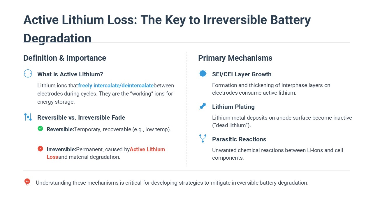 Active Lithium Loss stands as a primary culprit behind the irreversible capacity fade of lithium-ion batteries, a challenge that impacts devices from smartphones to electric vehicles worldwide. As lithium-ion batteries age, their ability to hold a charge diminishes, and distinguishing between reversible and irreversible degradation is essential for optimizing battery performance and lifespan. Reversible fade, often triggered by extreme conditions like low temperatures or high discharge rates, can be reversed when the battery returns to normal operating conditions. In contrast, irreversible fade—caused primarily by Active Lithium Loss and electrode material degradation—permanently reduces the battery’s capacity, even under optimal use.