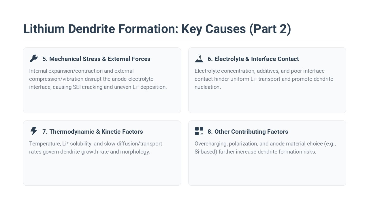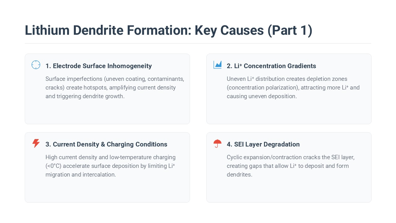 - Microscopic defects such as cracks or pores on the anode surface, which act as “seeds” for dendrite nucleation.