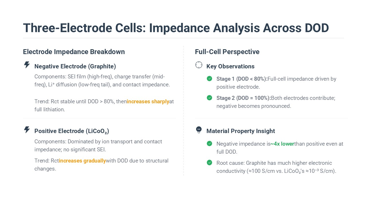 - DOD < 80%: The increase in charge transfer impedance is primarily driven by the positive electrode. At lower DOD levels, the negative electrode’s high conductivity and efficient lithium intercalation keep its impedance minimal.