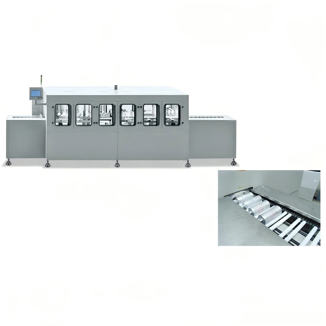 Automatic cleaning machine for lithium-ion batteries after sealing. Integrates feeding, spraying, washing, air cutting, rinsing and drying functions.