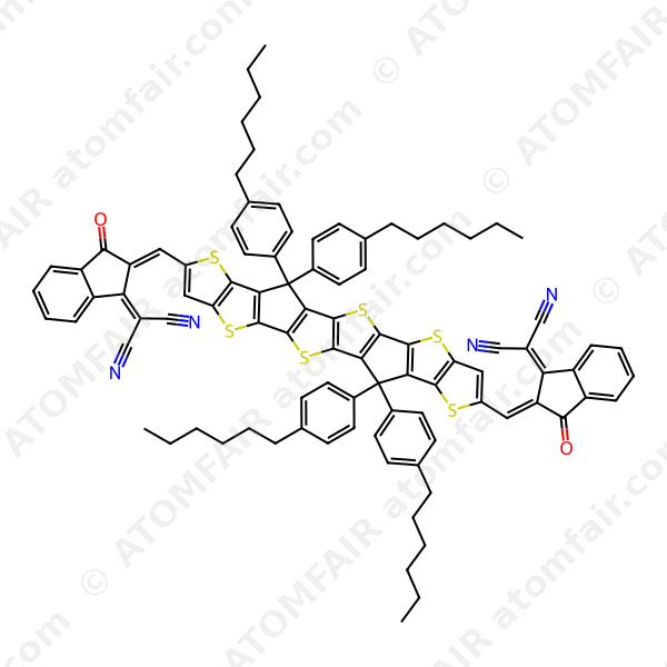 Alias: 2-[(2E)-2-[[20-[(E)-[1-(dicyanomethylidene)-3-oxoinden-2-ylidene]methyl]-3,3,16,16-tetrakis(4-hexylphenyl)-6,10,13,19,23,26-hexathiaoctacyclo[12.12.0.02,12.04,11.05,9.015,25.017,24.018,22]hexacosa-1(14),2(12),4(11),5(9),7,15(25),17(24),18(22),20-nonaen-7-yl]methylidene]-3-oxoinden-1-ylidene]propanedinitrile; :?2-[(2E)-2-[[20-[(E)-[1-(dicyanomethylidene)-3-oxoinden-2-ylidene]methyl]-3,3,16,16-tetrakis(4-hexylphenyl)-6,10,13,19,23,26-hexathiaoctacyclo[12.12.0.02,12.04,11.05,9.015,25.017,24.018,22]hexacosa-1(14),2(12),4(11),5(9),7,15(25),17(24),18(22),20-nonaen-7-yl]methylidene]-3-oxoinden-1-ylidene]propanedinitrile; 2,2′-[[6,6,12,12-Tetrakis(4-hexylphenyl)-6,12-dihydrothieno[2”,3”:4′,5′]thieno[3′,2′:4,5]cyclopenta[1,2-b]thieno[2”’,3”’:4”,5”]thieno[2”,3”:3′,4′]cyclopenta[1′,2′:4,5]thieno[2,3-d]thiophene-2,8-diyl]bis[methylidyne(3-oxo-1H-indene-2,1(3H)-diylidene)]]bis[propanedinitrile]; Propanedinitrile,2,2′-[[6,6,12,12-tetrakis(4-hexylphenyl)-6,12-dihydrothieno[2”,3”:4′,5′]thieno[3′,2′:4,5]cyclopenta[1,2-b]thieno[2”’,3”’:4”,5”]thieno[2”,3”:3′,4′]cyclopenta[1′,2′:4,5]thieno[2,3-d]thiophene-2,8-diyl]bis[methylidyne(3-oxo-1H-inden