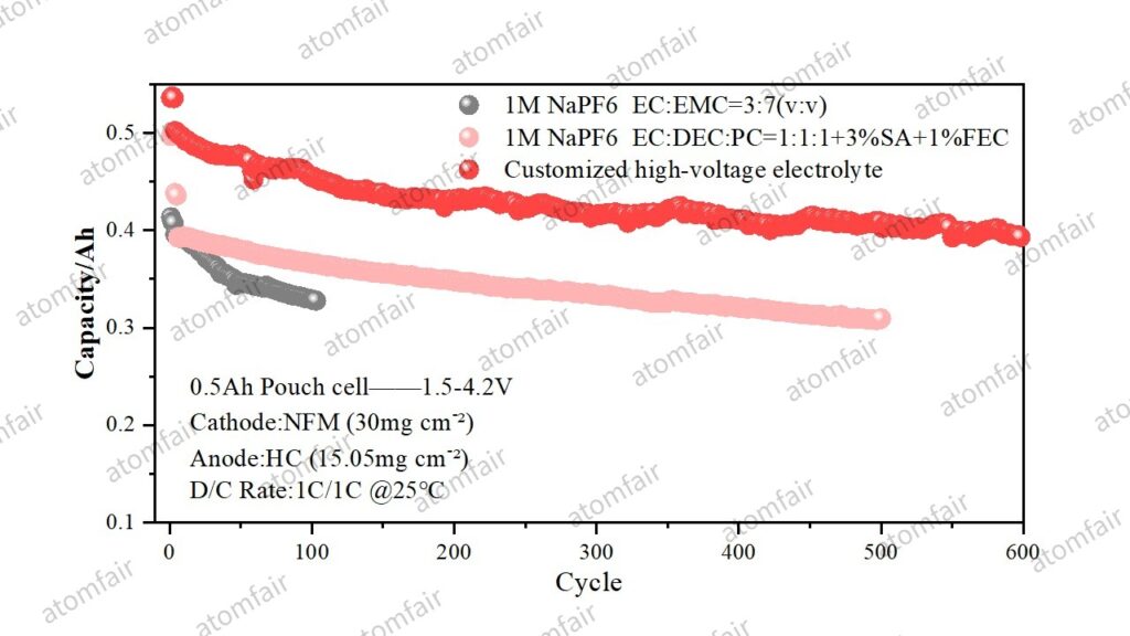 We utilized industrial-grade 1Ah pouch full cells to conduct limit-testing on the NFM-HC (Nickel-Iron-Manganese || Hard Carbon) system within an ultra-wide voltage window of 1.5V – 4.2V.
