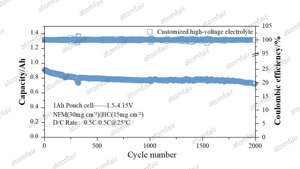 Increasing the cut-off voltage to 4.15V fundamentally transformed the energy performance. By employing a Customized High-voltage Electrolyte to suppress oxidation: