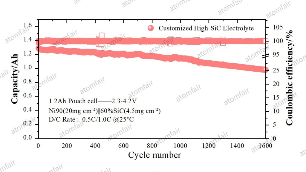 - Cycle Life: By utilizing a Customized High-SiC Electrolyte, the cell achieved over 1,600 stable cycles.